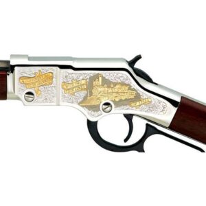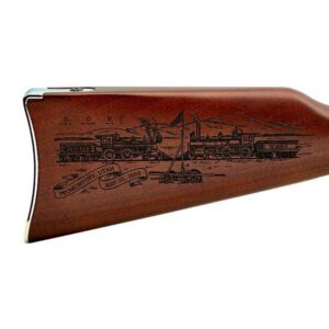 The American Railroad Tribute edition of the Henry Golden Boy is an outstanding American tribute to a vital American industry, in recognition of all who keep the rolling stock moving. The engraved receiver commemorates the 1869 completion of the first transcontinental railway and the driving of the golden spike, along with period style scrollwork. The walnut stock is laser etched with a scene of the legendary Promontory, Utah event.