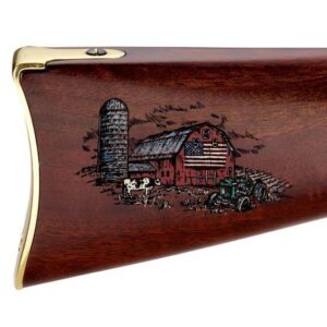 This tribute edition specifcally salutes the American farmer, and features detailed scenes of farming life engraved directly into the receiver. Additional images are also lovingly carved into the American Walnut stock.